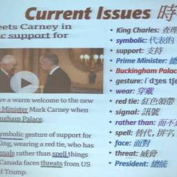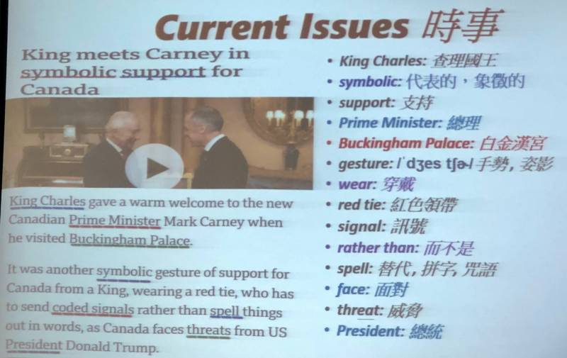 | 第七週 | 7 | 會話和時事 | 會話練習, 國內外重大新聞時事解析, 教導學員學習如何播報新聞. |